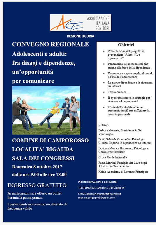 Interverranno: Debora Murante, presidente A. Ge. Ventimiglia; Gabriele Gramaglia, psicologo clinico esperto in dipendenza da internet; Monica Borgogno, psicologa e consulente familiare; Croce Verde Intemelia; Paola Martini, famiglie del Club degli Alcolisti in Trattamento; Kalah Academy di Lorenzo Principato.