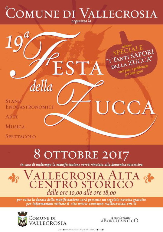 L’Amministrazione Comunale di Vallecrosia, organizza la “19ª Festa della Zucca”, evento clou dell’Autunno del Ponente Ligure, nella splendida cornice del “Centro Storico” di Vallecrosia, che domenica 8 ottobre 2017, dalle ore 10 fino alle ore 18, si ravviverà di magici colori e si racconterà attraverso itinerari di Zucche, di Fiori, e di Arte, ma anche di Cultura, di Musica, di Spettacolo e soprattutto di Enogastronomia visto che quest’anno sarà un’edizione speciale dal sottotitolo “i Tanti Sapori della Zucca, piatti e prelibatezze per tutti i gusti”.