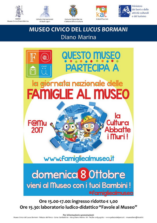 Domani, domenica 8 ottobre 2017 il Museo Civico del Lucus Bormani di Diano Marina aderisce alla quinta edizione della “Giornata Nazionale delle Famiglie al Museo”, evento promosso in tutta Italia dalla Kids Art Tourism con il patrocinio del Ministero dei Beni e delle Attività Culturali e del Turismo.