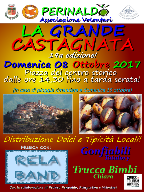 Domani, domenica 8 ottobre, a partire dalle ore 14.30 a Perinaldo, appuntamento con ‘La Grande Castagnata’. Si potranno degustare Dolci e Tipicità Locali e la giornata sarà allietata dalla musica dei Rela Band. Per i bambini saranno allestiti Gonfiabili con Tata Lory e Chiara la Truccabimbi. In caso di pioggia l'evento sarà rimandato alla domenica successiva 15 ottobre.