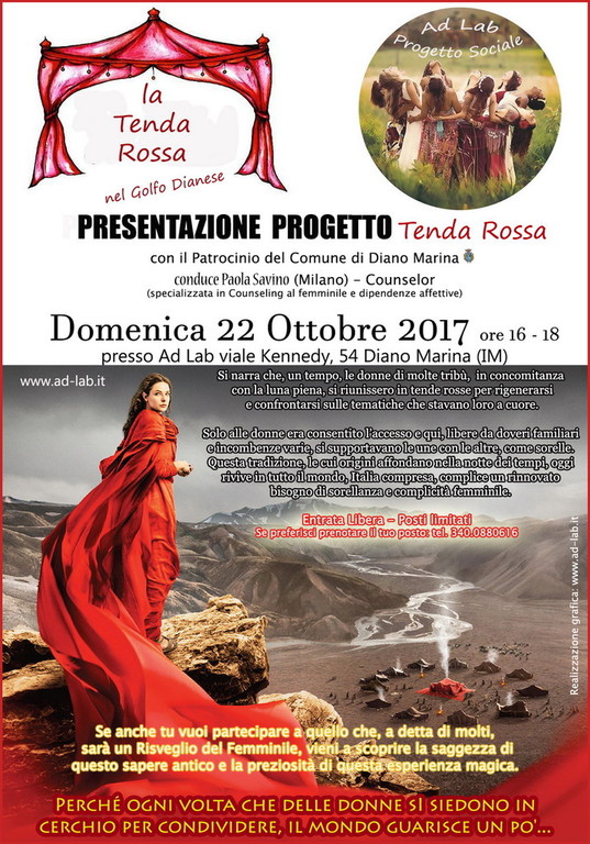 Per questo motivo, l'Associazione AD LAB di Diano Marina, sempre attenta alla cultura, al sociale e alle novità, ha aderito al circuito ufficiale di tutte le Tende Rosse italiane (a sua volta appartenente a quello internazionale) e propone, col Patrocinio del Comune, l'organizzazione di questo progetto anche per il territorio del Golfo Dianese.