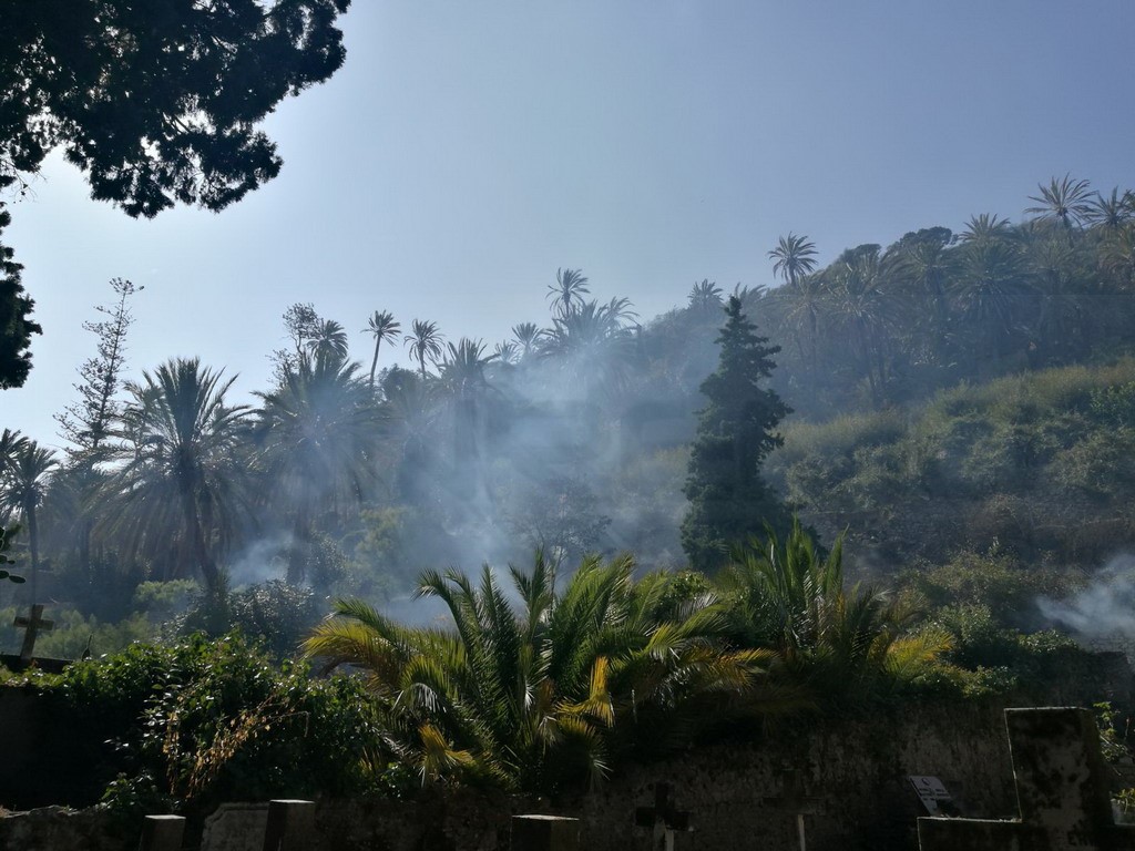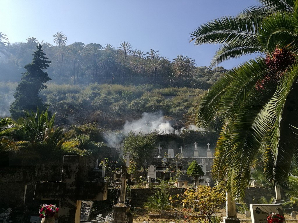 Incendio di sterpaglie, nel primo pomeriggio di oggi intorno alle 13 a Bordighera, tra il cimitero ed il ‘Beodo’, alle spalle di Arziglia.