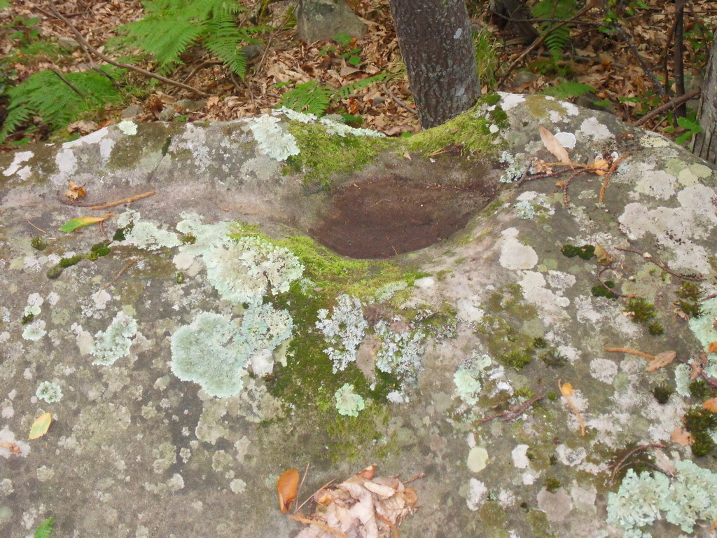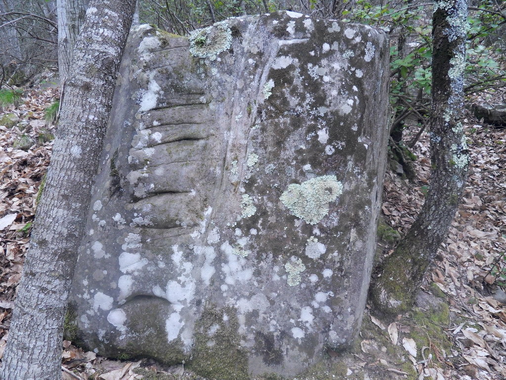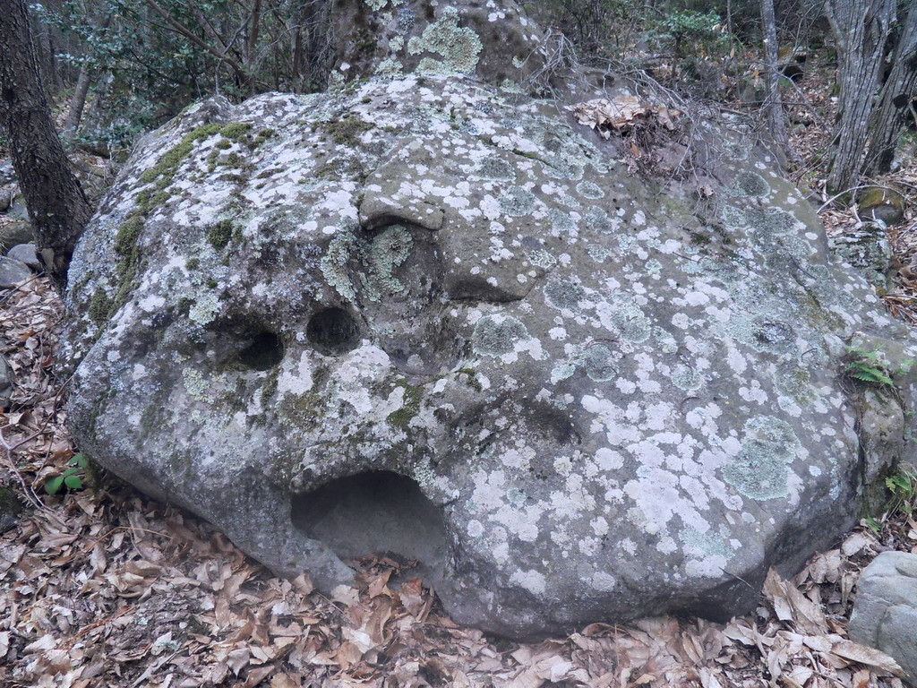 A breve distanza dall'altare e presente un grande masso di arenaria che probabilmente in origine era caratterizzato dalla sola presenza di due coppelle molto profonde disposte in modo frontale dove venivano inserire le offerte sotto le quali, attraverso un secondo intervento è stato praticato un grande foro con l'intento di schematizzare una figura mostruosa e demoniaca, con due grandi occhi e una bocca enorme spalancata. Probabilmente una esecuzione commissionata dalla chiesa nel periodo medioevale per incutere terrore nei contadini e pastori che continuavano a frequentare il luogo di culto pagano. Le più antiche testimonianze da parte dell'umanità primitiva di numerare eventi, sono rappresentate da 55 intagli rinvenuti su un osso di femore di un lupo messo in luce in una stazione archeologica nei pressi di Vestonice, nella repubblica Ceca con una datazione che si colloca nel Paleolitico Inferiore, 35.000 anni fa.