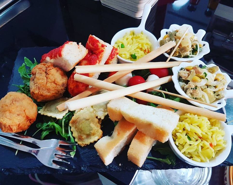 apericena con ricco tagliere di assaggi freschi della cucina, pizza, focaccia, fritti, salumi, patatine fritte e un piatto caldo del giorno: euro 8 (seconda consumazione euro 5).