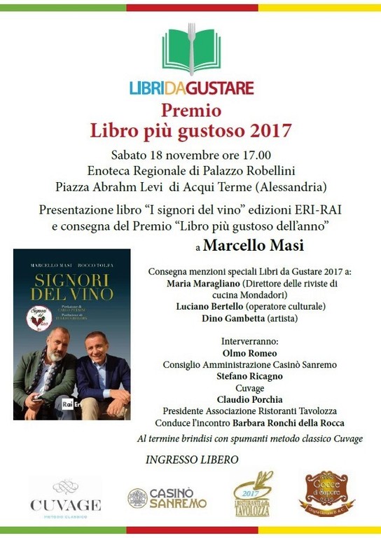L’appuntamento finale del percorso, iniziato in primavera con la consegna delle targhe di “Libri da Gustare” nella prestigiosa cornice del Teatro del Casinò di Sanremo, è previsto per sabato 18 novembre alle ore 17.00 nella sala dell’Enoteca regionale di Acqui Terme, quando sarà consegnato al giornalista Marcello Masi il premio “Libro più Gustoso dell’anno” per la pubblicazione “I signori del vino” scritto insieme con Rocco Tolfa e pubblicato da edizioni RAI-ERI.