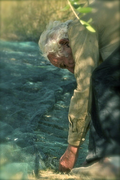 La giornata è bella e calda, il sole fa capolino tra gli alberi e crea effetti iridescenti. Le olive vengono abbacchiate mediante uno speciale sbattitore elettrico munito all’estremità di due pettini che passati tra i rami fa sì che le olive si distacchino e cadano a terra sopra le reti precedentemente posizionate che hanno il compito di raccogliere le olive che cadono al suolo.