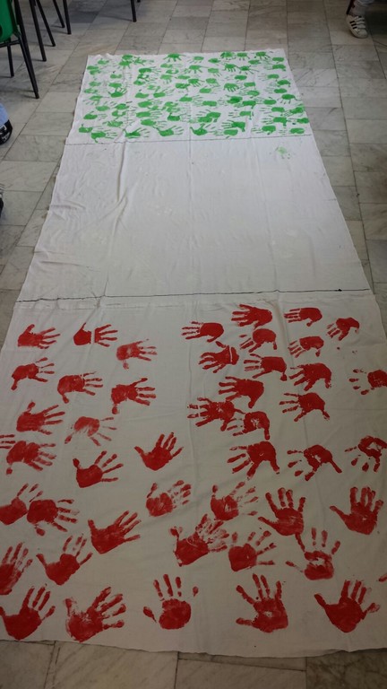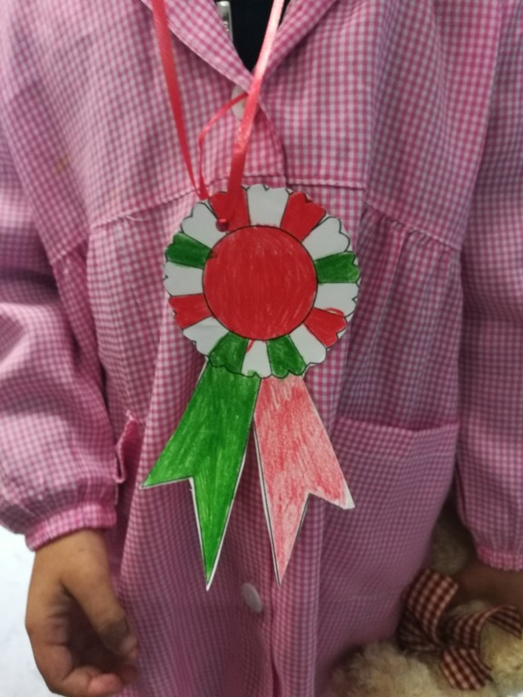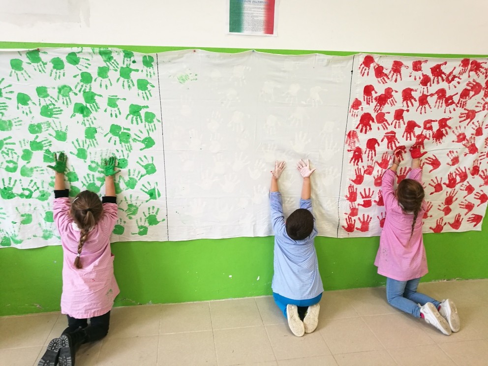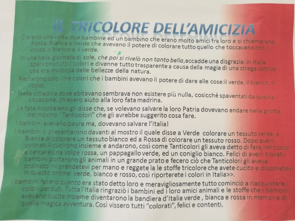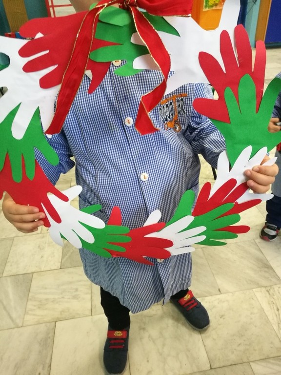 Significativo è stato l'entusiasmo che ha animato i piccoli alunni, soprattutto nella realizzazione dei vari lavori presentati nel corso dell'evento: dal racconto fantastico che tratta della nascita del Tricolore, fondata sullo spirito d'amicizia e di intraprendenza di due bambine ed un bambino, allo striscione tricolore stilizzato con le impronte di piccole mani tinte di verde,bianco e rosso, alla collana tricolore formata da manine colorate,e per finire alle didascalie dipinte dai piccoli alunni, inneggianti alle forze armate e alla realizzazione di un albero tricolore citando i versi della poesia di Giuseppe Ungaretti “Soldati”.