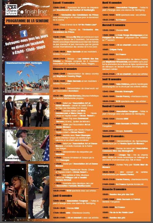 Trasferta benefica per gli Sbandieranti dei Sestieri di Ventimiglia. Sabato 11 novembre il Gruppo di Ventimiglia ha partecipato al via della 18a edizione della "No finish line Monaco" in calendario da sabato 11 a domenica 19 novembre, corsa benefica su un percorso di 1,4 km aperto 24h/24h nei pressi del Chapiteau de Fontvieille organizzata da "Children and Future Association". I ragazzi di Ventimiglia hanno fatto parte della cerimonia di apertura insieme alla prestigiosa Fanfara della Compagnia dei Carabinieri del Principe.
