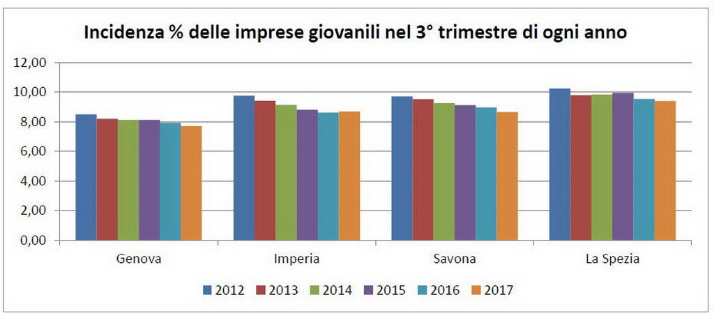 Nel panorama nazionale, è il Sud Italia a registrare il tasso di imprenditorialità giovanile più alto: la Liguria si colloca al 12° posto della classifica con un’incidenza delle imprese giovanili sul totale delle imprese attive pari all’8,98%, in calo di 2 decimi di punto percentuale rispetto al 2016. Sono considerate imprese giovanili l’insieme delle imprese in cui la partecipazione delle persone “under 35” risulta complessivamente superiore al 50% mediando le composizioni di quote di partecipazione e cariche attribuite.
