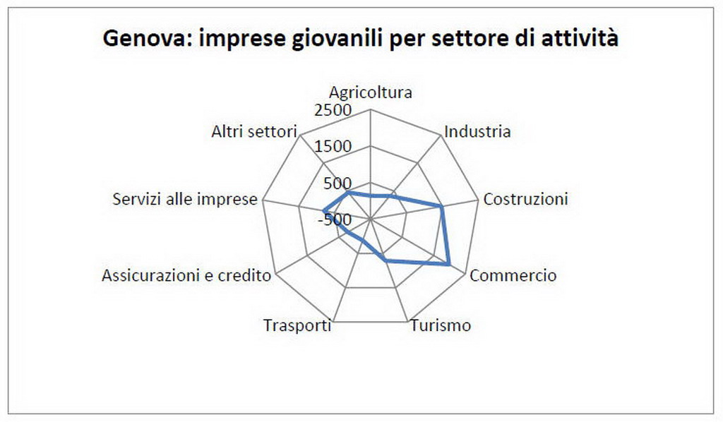 A Genova il 30% delle imprese “under 35” è registrato nel commercio, il 22% nelle costruzioni, il 12% nei servizi alle imprese e l’11% nel turismo.