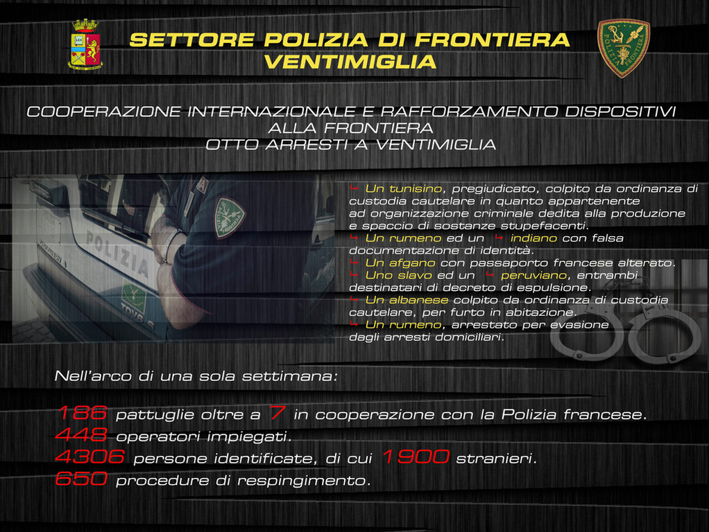 Notevoli i risultati conseguiti in questa ultima settimana dalla Polizia di Stato nell'ambito dei servizi di Polizia di Frontiera. Otto arresti in appena sette giorni sul confine di stato tra Ventimiglia e Mentone.