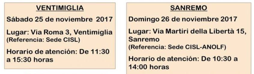 I peruviani e l’Anolf di questa provincia, nel ringraziare il console generale del Perù Alejandro Ugarte per l’impegno profuso nel portare avanti in questa provincia un ‘Consulados itinerantes’ saranno lieti di salutarlo nella giornata di sabato 25 novembre 2017 a Ventimiglia e domenica 26 novembre a Sanremo presso le sedi Cisl-Anolf (gli orari in basso). Il console sarà accompagnato dal vice console Elizabeth Guiven e da personale consolare per il disbrigo di pratiche che normalmente vengono effettuate nella sede consolare genovese.
