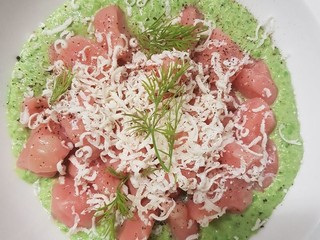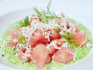 gnocchi rustici di patate rosse su vellutata di piselli con ricotta salata a piovere;