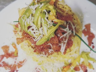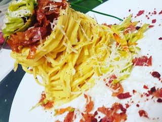 tagliolini alla carbonara con bacon croccante, polvere di bacon e uovo marinato.