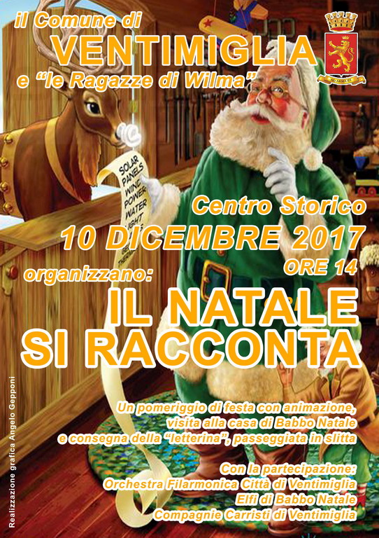 Alle 14 la grande slitta trainata dalle renne, opera della compagnia carrista “Cheli d’ina vota” presieduta da Tommaso Spanò, farà il suo ingresso trionfale da porta Nizza e porterà Babbo Natale, accompagnato dagli elfi, lungo via Garibaldi. Il Grande Vecchio accoglierà nella sua casa, allestita nel grande portico del Convento, i bambini che vorranno consegnargli la loro letterina. Per la prima volta sarà possibile incontrare nella casa ‘fatata’ anche mamma Natale, che sfornerà dolcetti e organizzerà il lavoro degli elfi, perchè tutto sia pronto per la Santa Notte. Chi lo vorrà, potrà partecipare ad una grande pesca di beneficenza e portarsi a casa un dono.