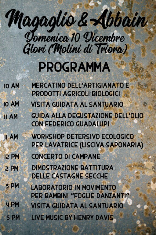 “A Glori parteciperanno una ventina di artigiani, veri artisti nel loro settore, dalle varie produzioni alcune delle quali affondano la loro origine nei tempi antichi. Sarà possibile trovare spunti interessanti ed eleganti per un regalo di Natale speciale” - assicura Gianluca Ozenda, presidente del consiglio comunale di Molini di Triora e promotore dell'iniziativa.“Magagliu e Abain non sarà solo un mercatino, vuole essere la festa del ripopolamento di Glori e dell’entroterra: la scommessa lanciata due anni fa ha visto arrivare nel piccolo borgo della Valle Argentina quattro nuclei famigliari di cui due con bimbi di pochissimi anni di età”.