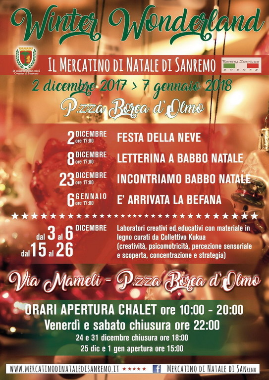 Domani, venerdì 8 dicembre, alle ore 16.30 in piazza Borea d’Olmo a Sanremo, è in programma l’inaugurazione ufficiale del mercatino di Natale alla presenza del Comune e di Tommy Services Events, società torinese vincitrice del bando triennale. Alle 17 appuntamento per tutti i piccini per con laboratori, mascotte e la casa di Babbo Natale.