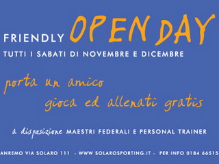 A tutti gli sportivi ed appassionati di tennis si ricorda che prosegue anche nel mese di dicembre l’iniziativa “Open Day” al Solaro Tennis Club che ogni sabato mette gratuitamente a disposizione i propri campi e la palestra per chi volesse trascorrere una giornata di sport in amicizia. Il Solaro ha inoltre 2 campi di calcetto, bar Ristorante e per ospitalità colorate camere in stile mediterraneo della Locanda Azzurra.