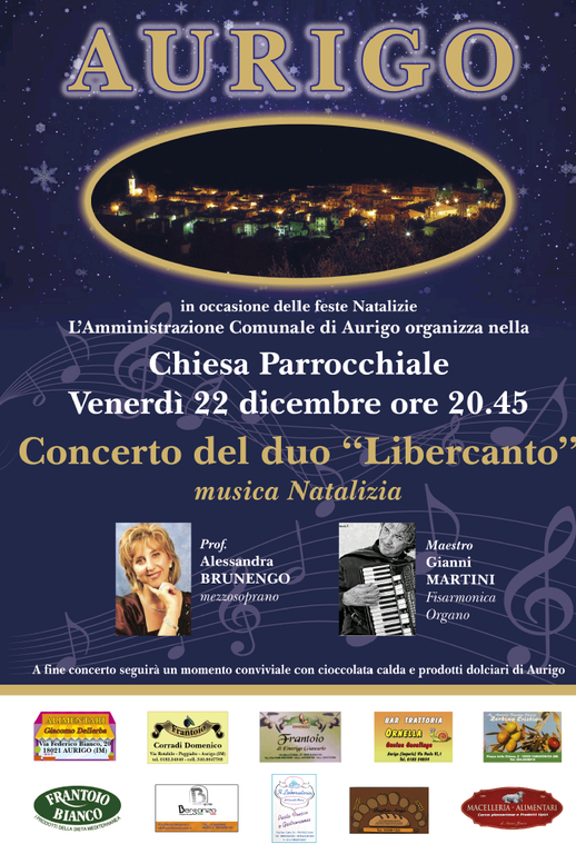 Venerdì 22 dicembre alle ore 20.45, ad Aurigo su iniziativa dell'Amministrazione comunale, grazie alla collaborazione dei titolari degli esercizi commerciali ubicati sul territorio del piccolo centro dell'alta valle Impero, si svolgerà presso la Chiesa Parrocchiale Natività di Maria Vergine, il concerto del ‘Duo libertango’ composto dal Maestro fisarmonicista Gianni Martini e dal mezzosoprano Alessandra Brunengo.