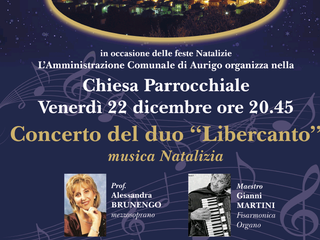 Venerdì 22 dicembre alle ore 20.45, ad Aurigo su iniziativa dell'Amministrazione comunale, grazie alla collaborazione dei titolari degli esercizi commerciali ubicati sul territorio del piccolo centro dell'alta valle Impero, si svolgerà presso la Chiesa Parrocchiale Natività di Maria Vergine, il concerto del ‘Duo libertango’ composto dal Maestro fisarmonicista Gianni Martini e dal mezzosoprano Alessandra Brunengo.