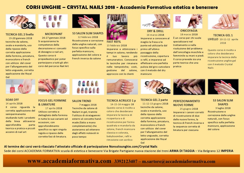 Accademia Formativa, scuola di estetica e di benessere di Imperia ed Arma di Taggia, in collaborazione con l’Accademia di Irene Merlo di Savona organizza corsi di unghie. Il 2017 si sta concludendo, ma il calendario dei corsi nails proposto dalle due scuole è molto ricco.