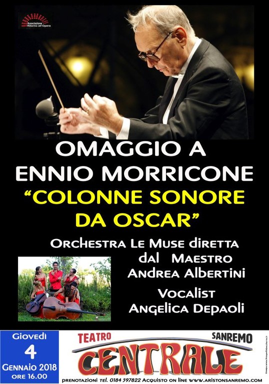 Appuntamento con la grande musica da non perdere quello di giovedì 4 gennaio alle ore 16, al Teatro Centrale di Sanremo. L’evento sarà dedicato al recente premio Oscar conferito ad Ennio Morricone per la miglior colonna sonora del film di Quentin Tarantino “The Hateful 8”. Il programma sarà incentrato sulle più belle colonne sonore scritte dal grande compositore romano, dagli esordi con Sergio Leone (1964, “Per un pugno di dollari”) fino alle più recenti collaborazioni con Tornatore, Joffè e Tarantino.