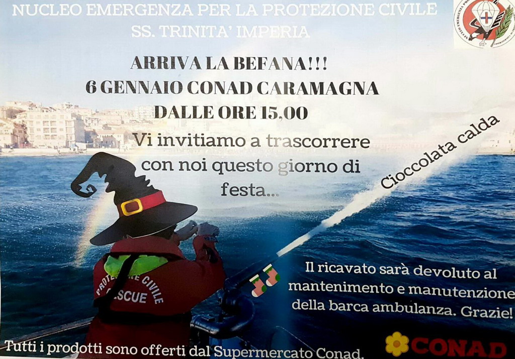 Organizzato dal Nucleo Emergenza per Protezione Civile della SS Trinità di Imperia, si svolge sabato pomeriggio alle 15, presso il Conad di Caramagna, l’appuntamentio con ‘Arriva la Befana!’