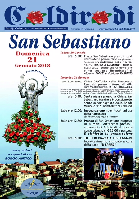 Sarà soltanto il primo di una lunga serie di iniziative per San Sebastiano. Il giorno seguente, Domenica 21 gennaio, la giornata di festeggiamenti prenderà il via alle 10.30 con la tradizionale Messa seguita dalla Processione lungo le vie del paesino. Alle 12, inaugurazione dei nuovi locali ad uso della parrocchia. Seguirà il pranzo con menù tipico nei quattro ristoranti del paese e infine grande festa in piazza con l'intrattenimento musicale a cura della band D-Sparsi, a partire dalle 16.