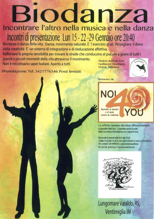 A Ventimiglia iniziano i corsi di Biondanza. Gli incontri di Lunedì 22 e 29 Gennaio sono stati promossi dall’associazione “Sportello Antiviolenza NOI4YOU” di Bordighera. L’incasso verrà devoluto allo Sportello operativo presso la Croce rossa di Bordighera.