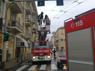 Sanremo: semaforo pericolante dallo 'Zampillo', intervento dei Vigili del Fuoco (Foto)
