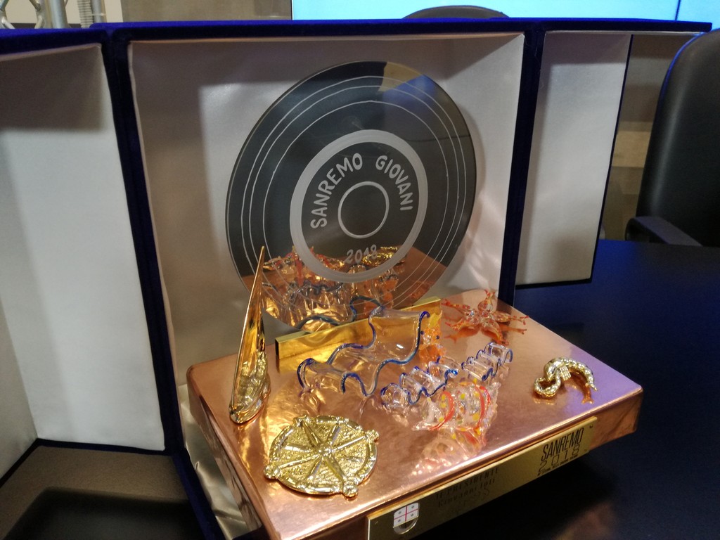 Il premio che verrà consegnato al vincitore delle Nuove proposte è stato realizzato grazie al supporto del marchio “Artigiani in Liguria”: si tratta di un’opera a tema marinaro, un disco in vetro su un supporto in rame fatto a mano, con intarsi in ottone. Attorno al disco, emergono altre decorazioni in vetro che rappresentano stelle marine e conchiglie. Gli artisti che hanno realizzato il premio sono Filippo Passalacqua di Sori e Giancarlo Faccio di Genova per le parti in metallo, Vanessa Cavallaro e Costantino Bormioli, entrambi di Altare, per quelle in vetro. Un tema scelto per augurare al vincitore di poter veleggiare con il vento in poppa in un mare di successo, partendo da quello ligure e di Sanremo, trasparente, pulito e ricco di vita.