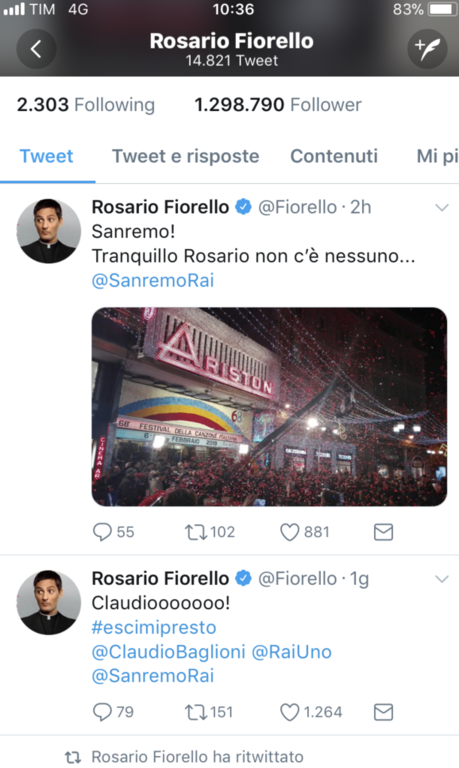 Intanto Fiorello ha postato su Twitter un’immagine del red carpet di ieri sera, scherzando ironicamente “Sanremo! Tranquillo Rosario non c’è nessuno. Non resta che aspettare di vederlo sul palco dell’Ariston.