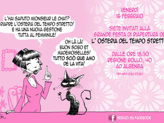 Dopo una lunga ed inutile attesa di poter trasferire l’Osteria nel centro storico di Albenga, di fronte alle insormontabili difficoltà di ordine burocratico, la chef Cinzia Chiappori ha rotto gli indugi ed ha deciso di rimanere negli attuali locali, procedendo a un rinnovamento dei locali. In questi giorni il ristorante ha cambiato completamente aspetto e Cinzia, giocando sulla tonalità del rosa ha reso più luminoso il locale e annunciato il nuovo corso del locale tutto al femminile dalla cucina alla sala. L’inaugurazione del nuovo locale è prevista per il prossimo 16 febbraio con una grande festa, che permetterà ai clienti di scoprire anche la nuova proposta gastronomica: a pranzo un interessante menù di lavoro gourmet al costo di 15 euro e la sera un menù a prezzo fisso con la scelta di piatti all’interno della carta, in grado di accontentare tutti: gli amanti del pesce o della carne, ma anche i vegetariani e con qualche soddisfazione per i vegani. In carta tutte le sue preparazioni tradizionali con spunti creativi e l’utilizzo della materie prime del territorio; serate a tema con verdure e piatti di stagione ed eventi con aziende agricole della zona. Non mancheranno i corsi, dal pane alla cucina con i fiori e le erbe selvatiche, e la presenza di un pianoforte in sala anticipa qualche suggestione musicale, tutta da scoprire. Per l’occasione la disegnatrice e illustratrice torinese Darinka ha messo a disposizione dell’osteria i suoi personaggi Miss D(ice) e Monsieur le Chat che hanno ottenuto grande successo nei social, in televisione e come protagonisti di due libri a fumetti e diversi calendari illustrati editi da Tempesta Editore.