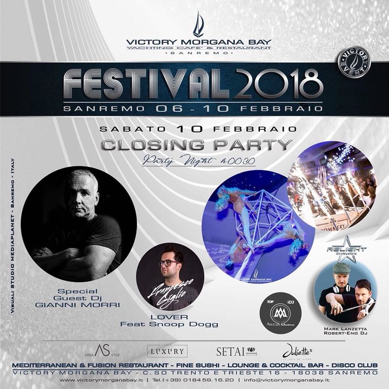 Ultima grande serata, domani al Victory Morgana Bay di Sanemo. Ci sarà il ‘Closing Party’ che partirà con il Galà Dinner dalle 20 con l’intrattenimento musicale di Dario Moro e Patti Patti.