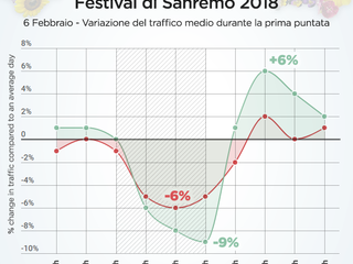 Per la sola Liguria il picco si è registrato alle 23 con un -9%. Da quel momento l’impennata che è andata a coincidere con la fine della trasmissione, riportando gli accessi ad un +6%. Su scala nazionale invece la curva è stata meno netta, raggiungendo il picco a -6% alle 22 e risalendo subito dopo.