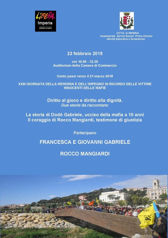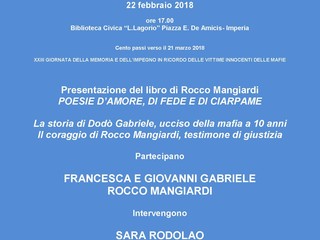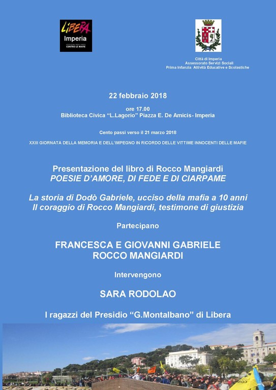 Il 21 saremo a Sanremo il mattino in compartecipazione con il Comune e poi il 22 avremo alcune importanti iniziative a Imperia. Al mattino ci sarà il consiglio comunale dei ragazzi, con il neo Sindaco Tommaso Rosa e le scuole di Imperia all’Auditorium della Camera di Commercio, in compartecipazione con il Comune. Al pomeriggio l’incontro alla biblioteca Lagorio con la cittadinanza che speriamo si impegni e venga per conoscere i genitori di Domenico Gabriele, per sentire la storia coraggiosa di Rocco Mangiardi, per sentire le sue poesie che faremo leggere dai ragazzi del presidio Montalbano del liceo Vieusseux.
