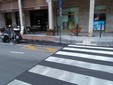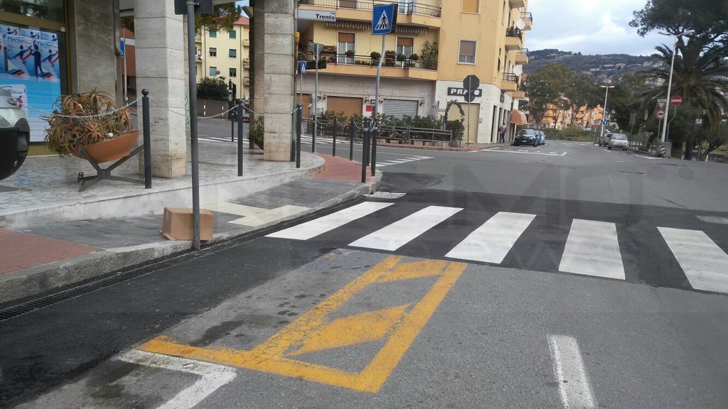 Strisce pedonali messe a dimora utilizzando una parte del parcheggio per portatori di handicap. E’ successo in via Trento, di fronte alla farmacia di Borgo San Moro ad Imperia.
