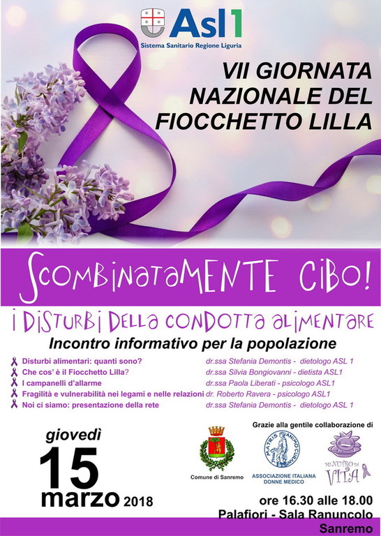 In occasione della VII Giornata Nazionale del Fiocchetto Lilla, dedicata ai disturbi del comportamento alimentare, l’ASL 1 Imperiese vi dà appuntamento il 15 marzo 2018, alle ore 16.30 presso la sala Ranuncolo del Palasalute di Sanremo, per un incontro aperto a tutta la popolazione dal titolo “ScombinataMENTE cibo”, organizzato dall’a dr.ssa Stefania Demontis, responsabile del servizio Nutrizione territoriale e Centro per i Disturbi Alimentari dell’Asl1.