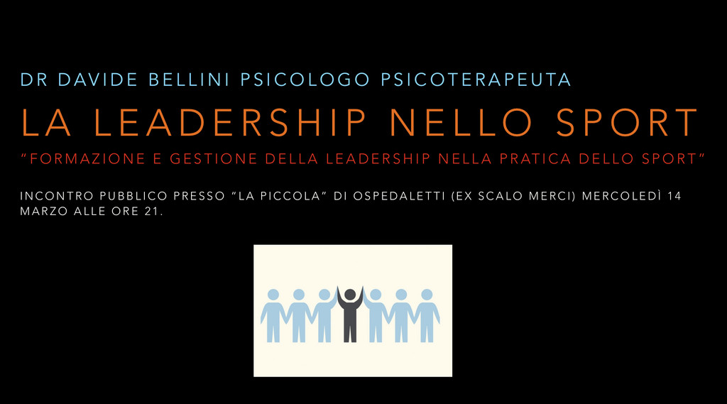 Lo psicologo e psicoterapeuta Davide Bellini propone l’incontro dal titolo “La leadership nello sport, formazione e gestione della leadership nella pratica dello sport”. Un approfondimento utile a chi pratica o segue lo sport a qualsiasi livello.
