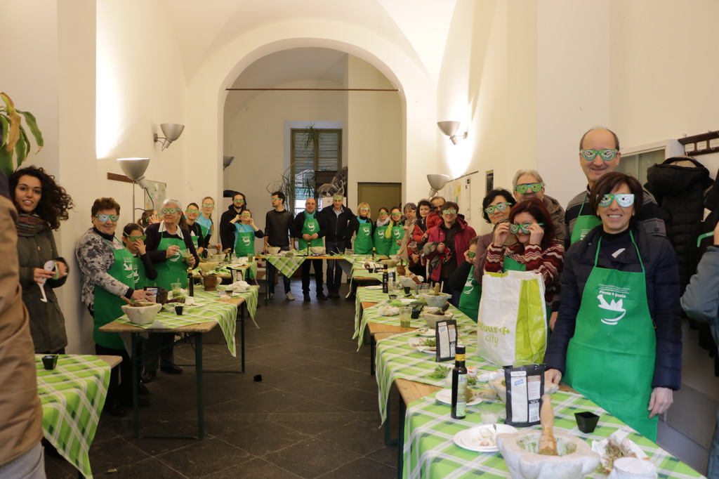 Muniti di mortati di marmo davvero antichi e visibilmente consumati dall’uso e dal tempo, guidati dai consigli di Milko, hanno proceduto alla preparazione del pesto alla ligure. Adulti e bambini, tra ‘pestate’ e risate, hanno trascorso quella che sembrava un’uggiosa domenica di marzo, nel divertimento generale.
