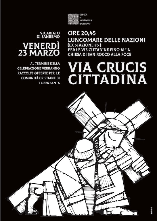 Doppio appuntamento il 23 marzo con la Via Crucis organizzata dalla Diocesi di Ventimiglia Sanremo. Venerdì sera, nella città dei fiori si svolgerà la processione cittadina che quest’anno partirà alle 20.45 dal Lungomare delle Nazioni, nei pressi dell'ex stazione ferroviaria e terminerà dalla Chiesa di San Rocco alla Foce.