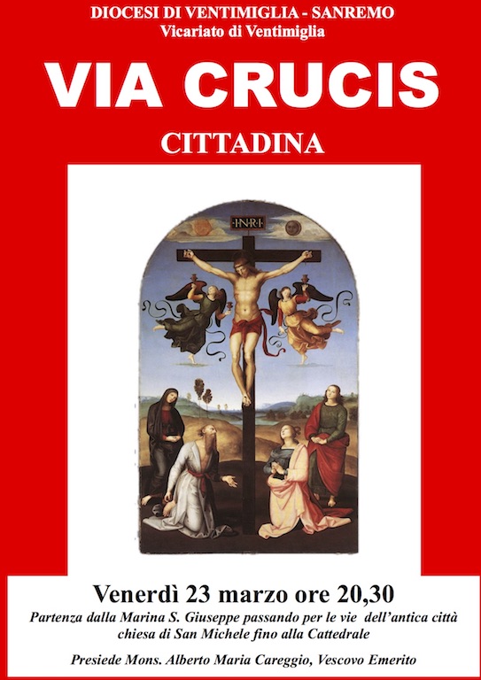La stessa sera, a Ventimiglia, le parrocchie della città di confine celebreranno il cammino di Cristo verso il calvario con partenza alle 20.30 dalla Marina di San Giuseppe. La processione, presieduta dal Vescovo emerito, Mons. Alberto Maria Careggio, attraverserà le vie dell’antica città giungendo in Cattedrale.