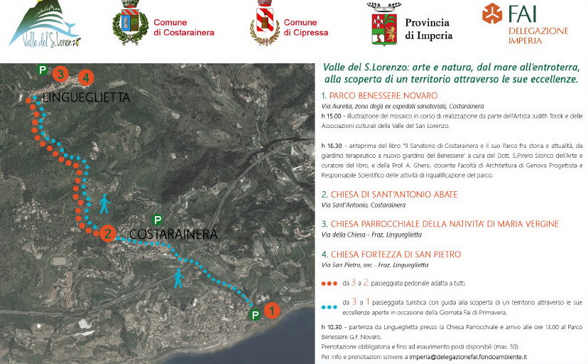 Anche quest’anno i visitatori potranno avvalersi di guide d’eccezione: gli esperti volontari del FAI e i Giovani Apprendisti Ciceroni® dell’Istituto Sup. Prof. di Stato per l'Agricoltura e l'Ambiente "D. Aicardi" di Sanremo. La valle del San Lorenzo è defilata dalle grandi direttrici di traffico e non tutti coloro che abitano il Ponente ligure la conoscono come meriterebbe. Il suo territorio sale dal mare ai 1150 metri del monte Faudo, suddiviso tra cinque comuni (San Lorenzo al Mare, Civezza, Costarainera, Cipressa, Pietrabruna) che comprendono otto borghi principali. Una valle aperta, luminosa, verdeggiante di olivi e di boschi; qui la storia non ha lasciato testimonianze grandiose ma sappiamo che molto spesso "piccolo è bello": tutta la nostra provincia è ricca di segni piccoli ma importanti che raccontano bene la storia della sua gente e del suo territorio. Durante la Giornata di Primavera non andremo alla scoperta dell'intera valle, non sarebbe possibile; conosceremo due borghi e quattro beni, testimonianze forti della storia e della cultura del territorio.