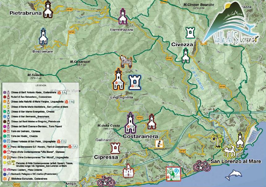 La valle del rio San Lorenzo è defilata dalle grandi direttrici di traffico della provincia di Imperia e non tutti la conoscono come meriterebbe. Il suo territorio sale dal mare ai 1150 metri del Monte Faudo, suddiviso in cinque comuni (San Lorenzo al Mare, Civezza, Costarainera, Cipressa e Pietrabruna) che comprendono otto borghi principali.