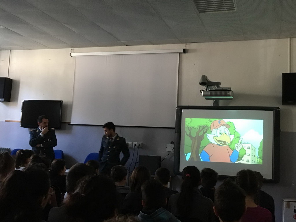 "Il personale della Guardia di Finanza ha illustrato tutte le attività svolte dal loro Corpo, non solo di polizia giudiziaria, ma anche economico-finanziaria; ad esempio i ragazzi sono stati portati a riflettere sulla necessità di pagare le tasse per non danneggiare la comunità, a non comprare merce contraffatta per non alimentare il contrabbando. Un altro importante settore di intervento della Guardia di Finanza è quello di controllo sulla contraffazione delle monete e delle banconote: sono stati indicati agli alunni gli accorgimenti per riconoscere una banconota da 20€ vera da una falsa. Al termine dell'incontro è stata presentata l'unità cinofila ed è stata effettuata una dimostrazione che ha particolarmente interessato ed entusiasmato gli alunni.