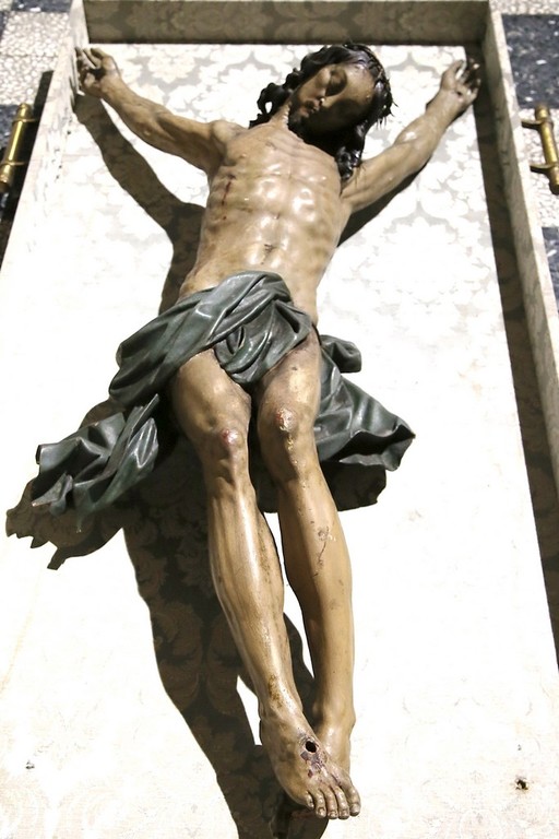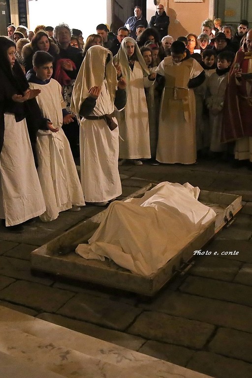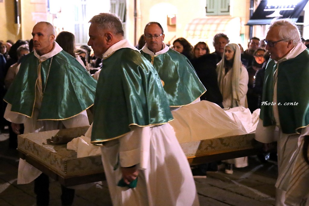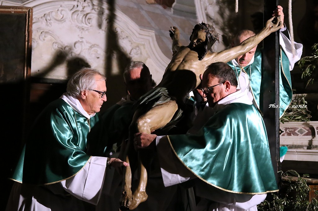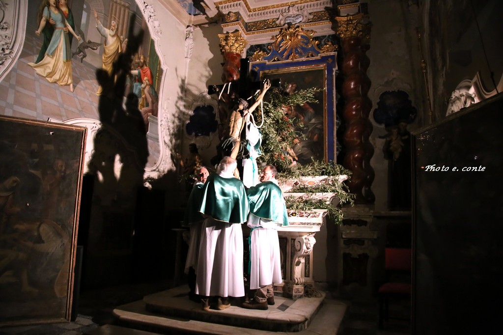 Il momento che più ha coinvolto emotivamente i numerosissimi fedeli presenti, e stata la deposizione del Cristo, avvenuta nell'Oratorio della Confraternita di San Bartolomeo, esistente a Bordighera da più di cinque secoli e recentemente ricostituita. Il sacro Cristo settecentesco di pregiata fattura con tratti rispecchianti la scuola genovese del Maragliano, è stato deposto dai membri della Confraternita e al lume delle candele su una cassa processionale in un grande momento di spiritualità quasi palpabile. Successivamente è stato ricoperto da un lenzuolo come ricordano le sacre scritture e deposto ai piedi del Santo Sepolcro.