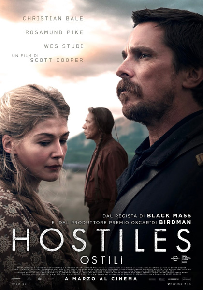 - HOSTILES – OSTILI – ore 16.30 - 21.30 - di Scott Cooper - con Christian Bale, Rosamund Pike, Wes Studi, Adam Beach, Rory Cochrane, Peter Mullan – Avventura - "1892, New Messico. Il leggendario Capitano Joseph Blocker sta per compiere la sua ultima missione prima di ritirarsi: scortare il capo indiano Cheyenne Falco Giallo dal forte dove è prigioniero alla riserva indiana situata nella sua terra d'origine, dove gli è stato concesso di tornare per trascorrere gli ultimi giorni della sua vita. I due rivali affronteranno un lungo viaggio di oltre mille miglia e durante il percorso incontreranno Rosalee, vittima di un attacco indiano di cui è unica superstite, che si metterà in cammino con loro…”