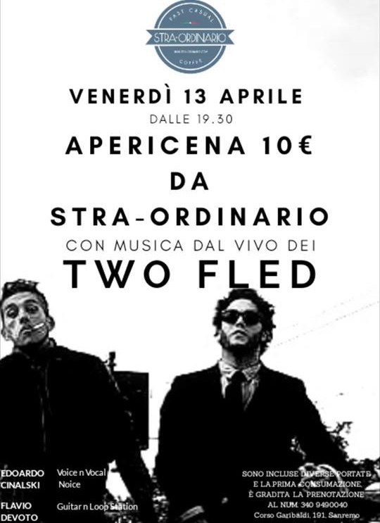 Il mese di Aprile dello Stra-Ordinario è scoppiettante e ricco di novità. Come preannunciato, venerdì 13 il locale di Corso Garibaldi ospiterà il duo locale dei Fled, promotori di un genere di musica definibile "Fusion". Il nome è sia il passato prossimo del verbo inglese Flee, "fuggito", che l'acronimo composto dalle prime due iniziali del nome degli stessi componenti del Duo: Flavio Devoto Guitar n Loop Station ed Edoardo Cinalski Voice n Vocal Noise, entrambi collaboratori ed amici con un bagaglio d'esperienza che racchiude, tra le altre mete, Torino, la Liguria, il Sud della Francia e Parigi. Il loro genere non conosce limiti, di gusto, di lingua e di stile, questi particolari li rendono adatti ad una vasta rete di pubblico: da Fred Buscaglione a Lady Gaga, da Pino Daniele a Stevie Wonder, la loro anarchia sonora non lascia scampo. Qui una recente esibizione:
