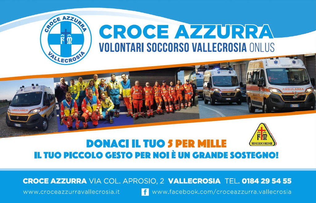 “Il tema salute e dell'assistenza socio-sanitaria sia di primaria importanza per tutti – prosegue la pubblica assistenza vallecrosina - ed è attraverso la nostra associazione che è possibile creare appositi progetti di pubblico interesse e formare nuovi operatori costruendo quel capitale umano e sociale fondamentale per il nostro territorio. Per donare il 5x1000 alla Croce Azzurra di Vallecrosia sarà sufficiente inserire nell'apposito spazio il nostro codice fiscale: 90062440087.