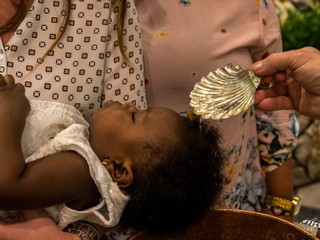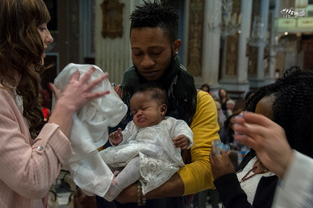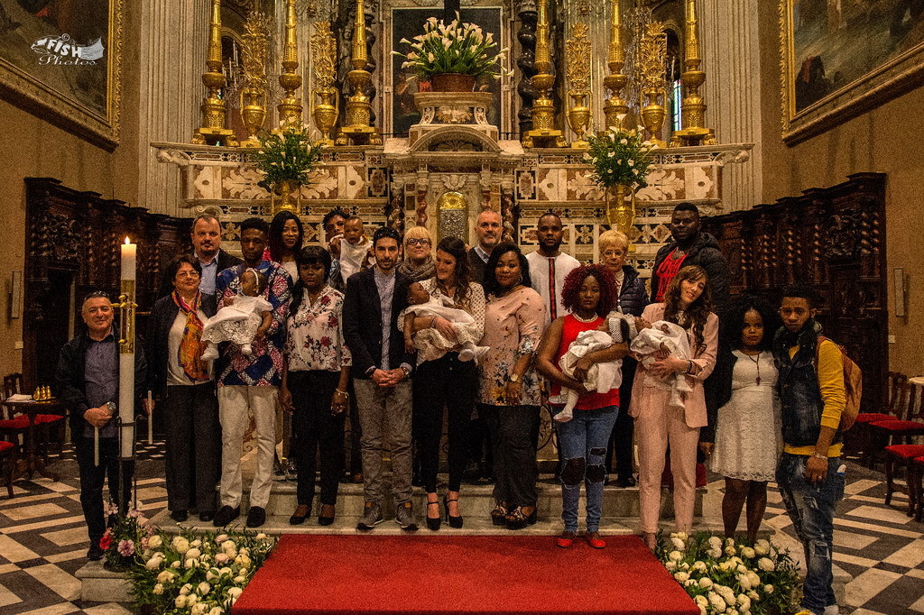 Domenica, prima dell’ingresso in Chiesa la piazza di San Giovanni è stata luogo di incontro tra battezzandi, con i loro bellissimi abiti realizzati a mano dalla Sartoria interna a Casa Madre Ada, genitori, padrini, madrine e da tutte le persone che hanno voluto condividere un momento di gioia: colori, suoni, abbracci, strette di mano, fotografie, risate ed un’emozione profonda. I genitori dei bambini, emozionati, hanno affermato: “Siamo cristiani e i nostri figli sono nati qui. Siamo felici di battezzarli nella città che ci accoglie”. Il rito del Battesimo è stato celebrato da Monsignor Ruffino insieme al sacerdote Don Paul Penda e al diacono Carlo Brilla e ogni momento del rito è stato fotografato da Marco Pesce, volontario sempre disponibile e presente.